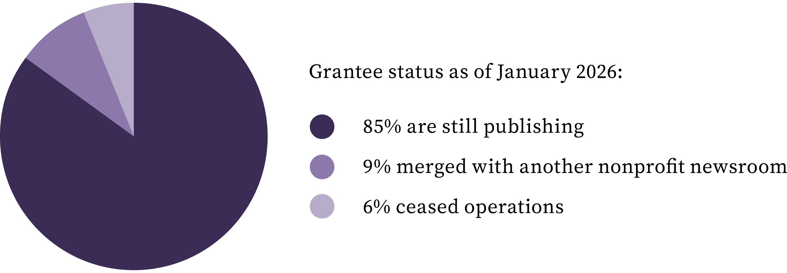 As of January 2026, 85% of newsroom grantees are still publishing. Another 9% merged with fellow nonprofit newsrooms, a form of consolidation that often reflects organizational health rather than failure. Only 6% ceased operations entirely. In a media environment that has been challenging for local and regional news outlets, those numbers represent a meaningful survival rate.